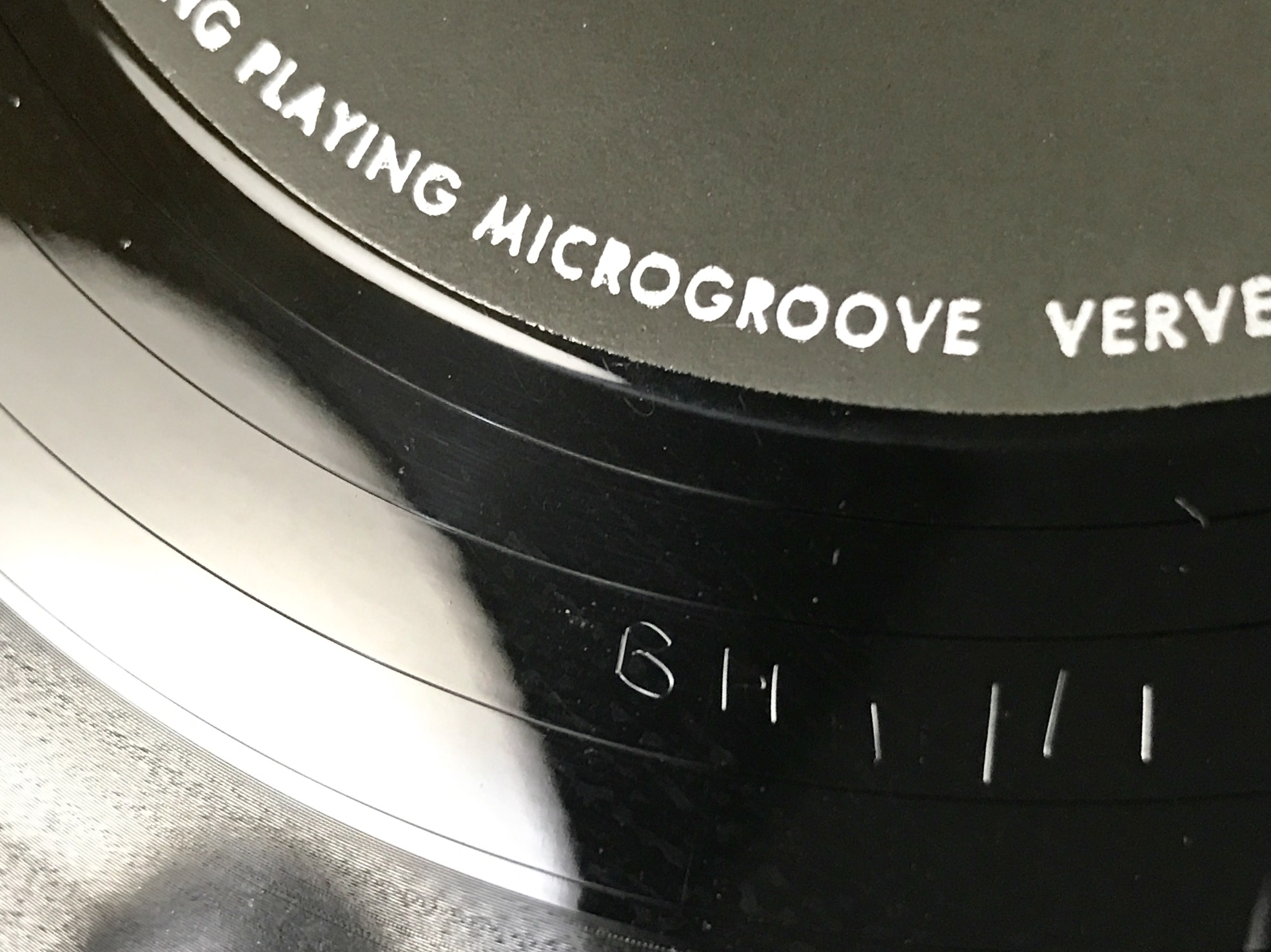 An original first pressing in ‘living sound’ stereo, with the pre-1961 Verve ‘Stereophonic’ labels, which by 1961 would’ve been at the tail-end of production. The lack of deep grooves implies a record press date of at least 1961, and the lack of the little trademark ‘r’ after ‘Verve’ on the label all point to a record made right at the cut-off point between labels. The runnout has both the record’s numeric code and side (V6-8392-A) and the record’s actual number (3076-1) written by hand.