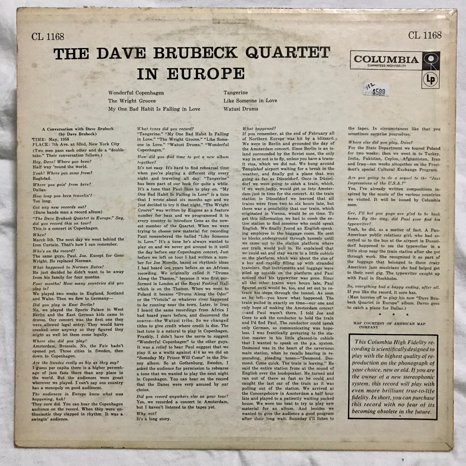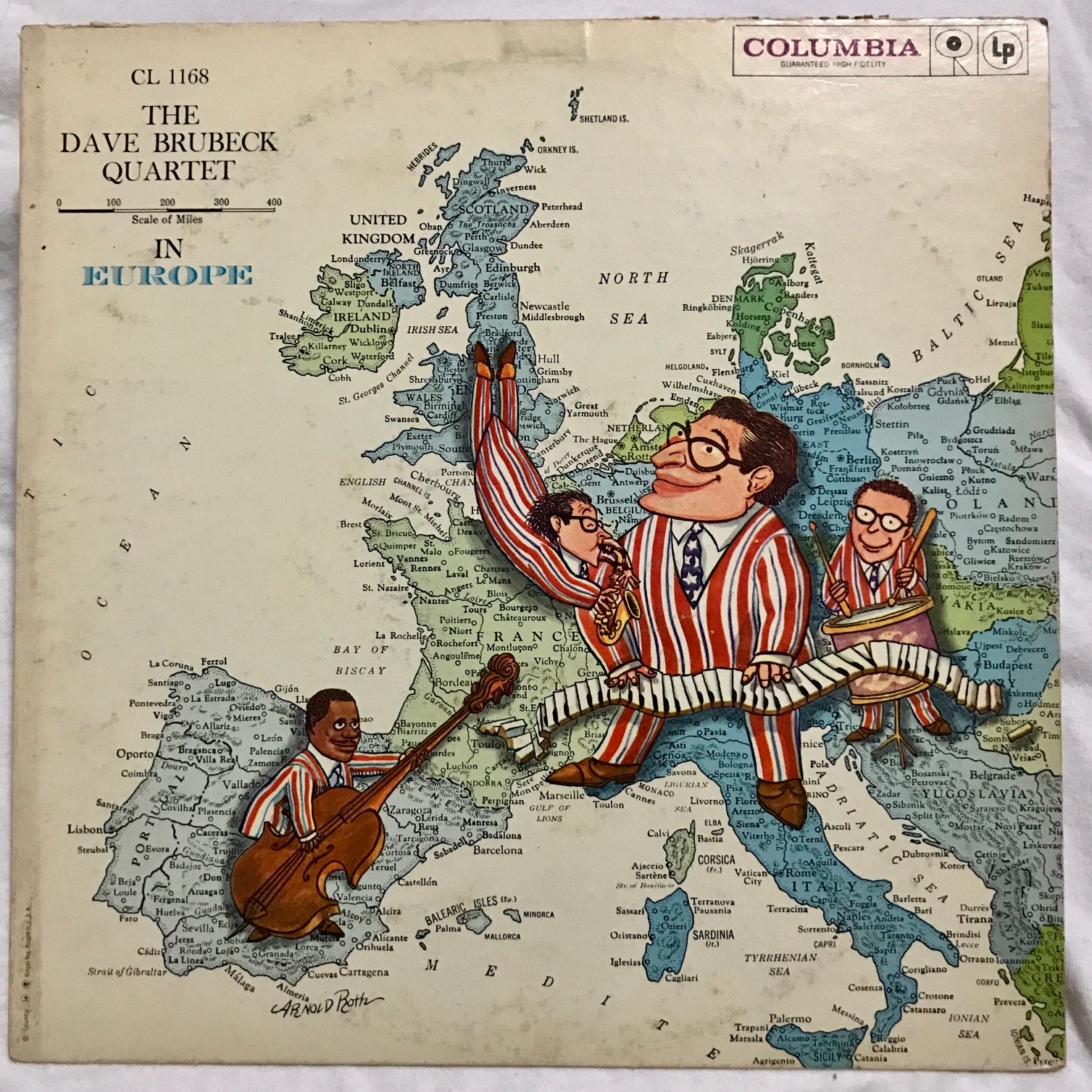 It’s almost funny when you think about it. They’re literally in Europe, both on the cover and on the record! The great cartoonist and illustrator Arnold Roth did the artwork. Roth was a close friend of Desmond’s, and Roth’s artwork graced numerous Brubeck albums throughout the 1950’s and early 60’s. The artwork was always humorous and whimsical and made for great art. It’s also kinda neat that they’re on the map of Europe; it makes for an engaging cover. Also, I don’t know if it’s just me or if it was intended, but I think it’s rather interesting that Eugene Wright is put in Spain by himself. Now, hear me out on this. The Moors, from north Africa, briefly controlled Spain a long time ago, and I wonder if Roth knew that and put Wright there on purpose…