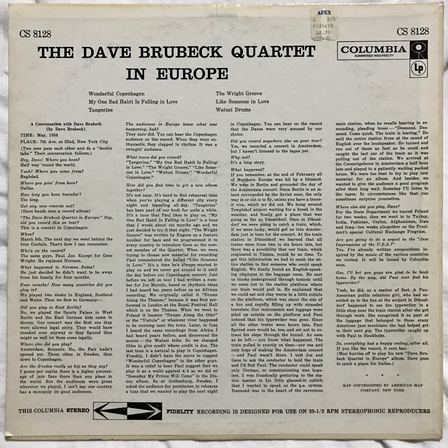 The liner notes, done by Dave Brubeck himself, are rather interesting as liner notes usually go. They’re done as a conversation, and Brubeck gives a lot ‘behind-the-scenes’ details and information about not just this record, but of the whole trip. There’s the story about how Desmond lost and then retrieved his typewriter, and for Brubeck fans there’s the tantalizing disclosure about more live tapes of the Brubeck Quartet locked in the vaults somewhere, waiting to be released. Both the cover and the back are in great condition, the whites still mostly white and the front suffering from slight ring-wear. Vintage original price tags are always a plus, in my opinion, anyhow. They can also be painful. Seeing that in the 1950’s somebody bought a record for under $3.00 while I bought it for $10 can be painful.