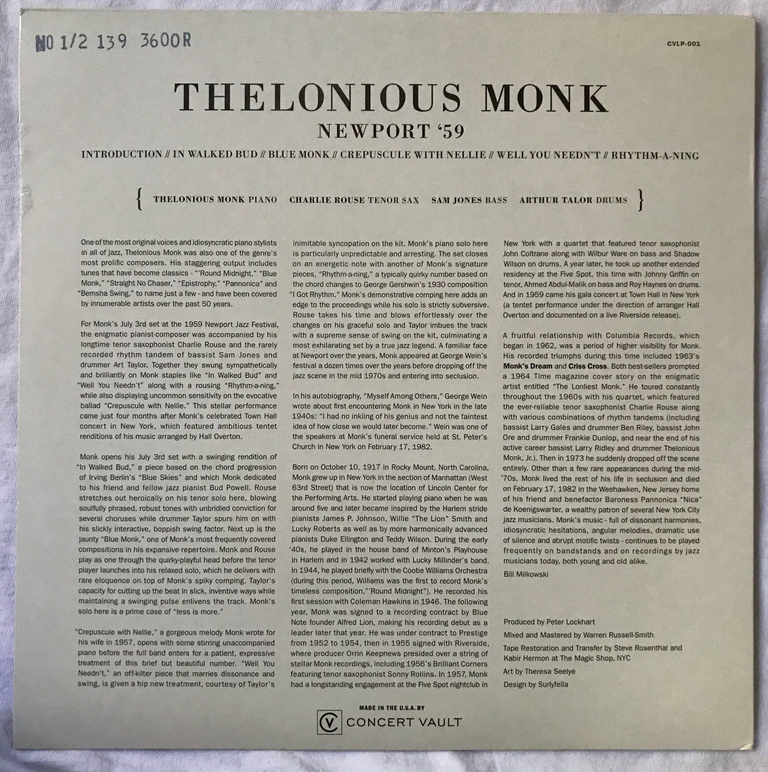 Luckily, that’s not an issue with this release. Concert Vault used the original tape as their source for the record, like they did in the 1950’s, and the result is a beautiful-sounding record. The music was miraculously recorded in stereo, and the sound engineers mastered it so that Charlie Rouse’s saxophone is in the center of the mix, with Monk’s piano and Jones’ bass on the left, Taylor’s drums on the right, and the audience ambiance throughout the mix. Considering this was recorded non-commercially, most-likely for rebroadcast on Willis Connover’s radio program, the sound is amazingly clear, spacious and life-like. The audio quality is on par with the best Columbia 6-eye studio albums. Or have I gone too far? Like I said, Concert Vault needs to press more of those beautiful-sounding stereo tapes of live performances to vinyl! There’s a ready market, and many of these performances are already out in terrible quality on numerous bootleg and semi-official CDs.