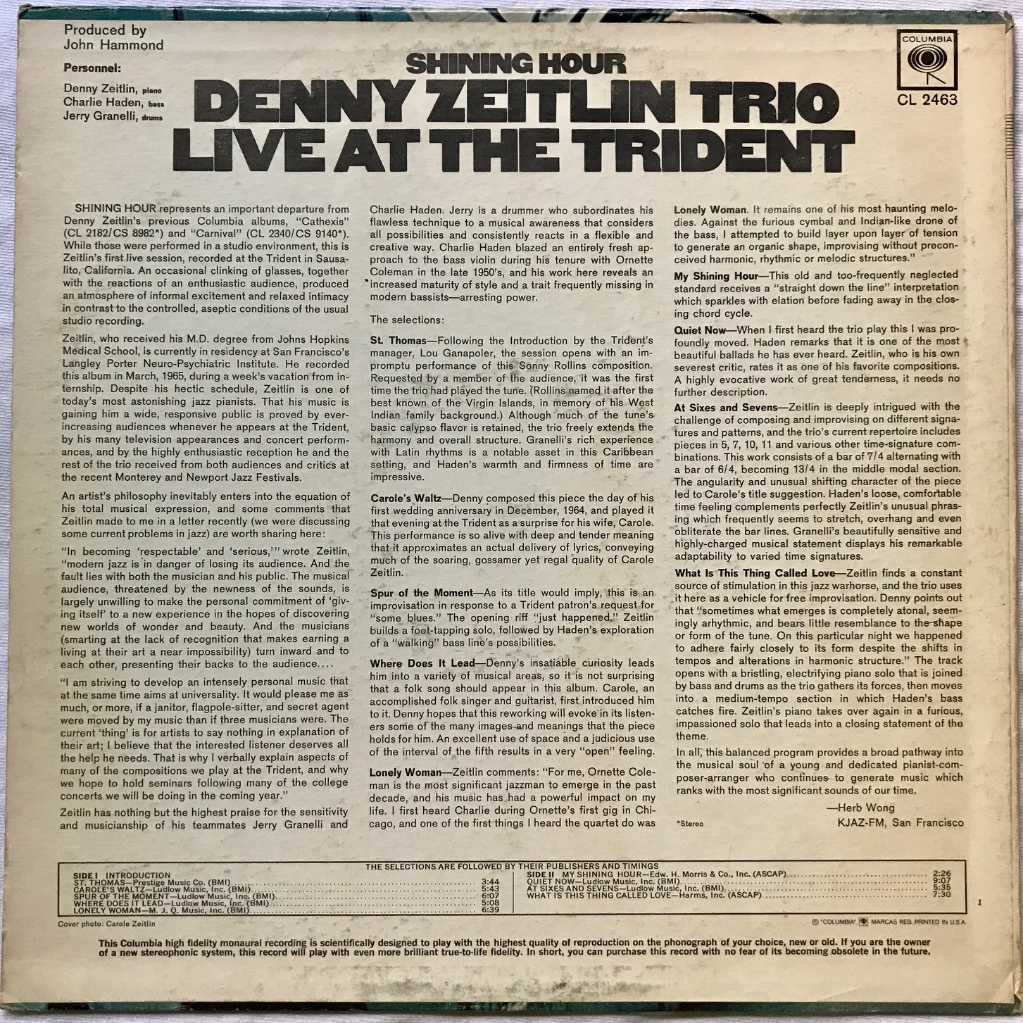 This was Denny Zeitlin’s third album and his first live album. It was recorded at the locally famous Trident, a jazz club in the city of Sausalito, California, near San Francisco. The resulting album from the tapes of his live appearances there during a week-long run in March of ’65 showcases a trio that is both tight and loose, swinging, and exciting. Zeitlin’s chords and free improv are ably assisted by free jazz pioneer Charlie Haden on bass. Haden made a splash with Ornette Coleman’s group in 1959, and is ever on the ball on this recording. Jerry Granelli may not initially ring any bells, but you have almost definitely heard him. He spent time in Vince Guaraldi’s trio, recording the Christmas album with Guaraldi before moving on to Denny Zeitlin’s trio. Having heard him politely but firmly supporting Guaraldi’s trio, it was a surprise to hear him tastefully fitting right in with Zeitlin’s more radical music (the group plays a tune that slips between 7/4 and 6/4, turning into 13/4. Brubeck would be proud).