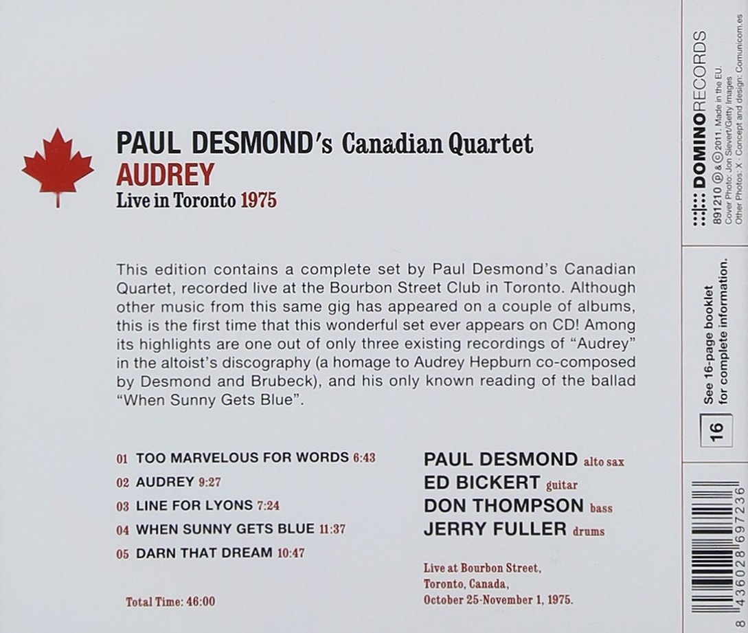 Dave sets a pastoral tone, then Paul sails in as Bob’s bates starts a head-bobbing walk. In what may be a humorous reference to the spontaneity of the proceedings, Paul’s “melody” to what became titled ‘Audrey’ is a veiled reference to the old pop song ‘Without A Song’. His solo is tasty, beautiful and witty, using Brubeck’s piano as fodder for his own musical inspiration. Brubeck picks it up where Desmond leaves it, playing subdued, sustained chords, then signals a change from the minor key into the major. Desmond reenters with the familiar ‘Balcony Rock’ tag, and the performance is over.