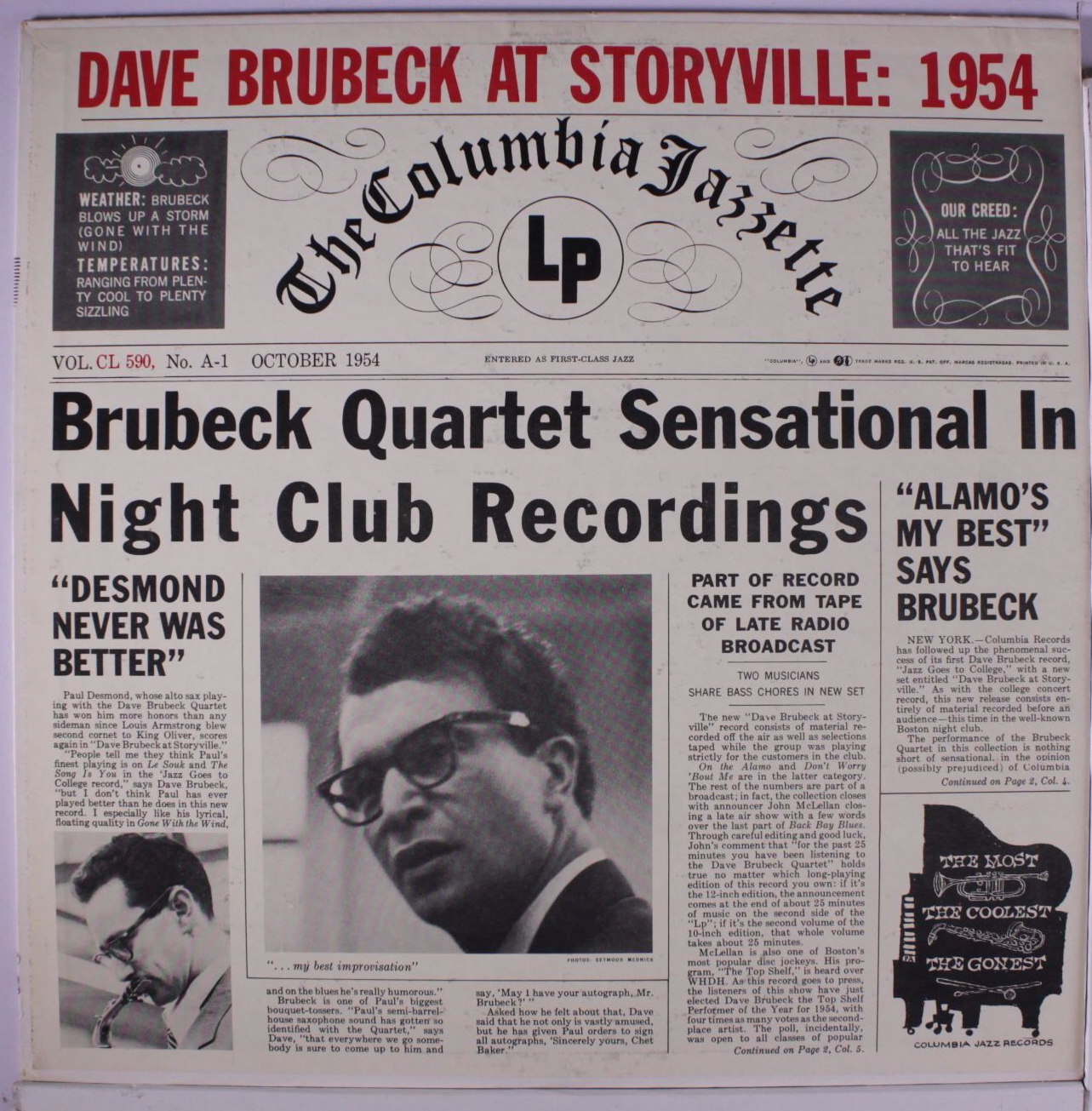 Recorded by the jazz radio show “The Voice of America”, this tape captures the Dave Brubeck Quartet live at the summer jazz bash on a warm Saturday night (the same day Paul McCartney met John Lennon). The recording engineer didn’t even try and come up with a title for this blues, simply naming it “Blues Improv”. Following a witty and humorous introduction by Master of Ceremonies Willis Connover, the group begins a jam on a blues in B-flat major. The blues melody and format is similar to “Bru’s Blues”, a tune they had recently recorded that appeared on their ‘Jazz Goes To Junior College’. Paul was in fantastic form that night, playing line after line of inspired, tasty line. After ten choruses, he hands it over to Norman Bates, who takes a short solo. Norman then gives the solo spot to Joe Morello, and although he’s using brushes, manages to build to a terrific fortisimo before dropping back down to a barely audible hiss. Brubeck’s solo is surprisingly succinct, playing a few choruses before Paul is back with some fun counterpoint. Desmond then begins his “Balcony Rock” tag and the song is over. I’ll have to write a separate post about this performance, because Paul was on FIRE the entire night.