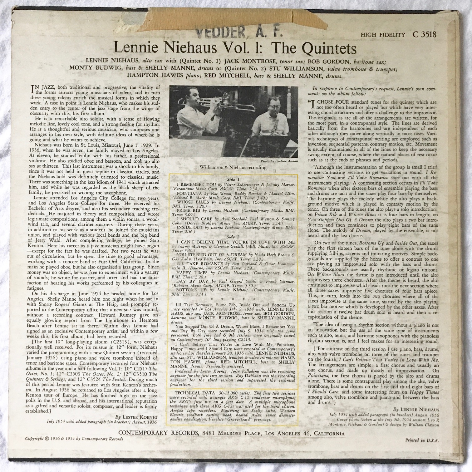 The cover has seen better days, that’s true, but it’s still holding on. One thing that I really appreciate about Contemporary’s albums is that they were painstakingly complete when it came to album information. Personnel, the date, the location, even the recording equipment all was included. The album is an original, as distinguished by the yellow border around the album info and the address on the bottom. Like I mentioned earlier, part of this album was released as a 10″ LP in 1954, then reissued with new performances in 1956 as a 12″, hence the two copyright dates. The liner notes are informative, written by Contemporary’s own Lester Koenig and the man himself, Lennie Niehaus.