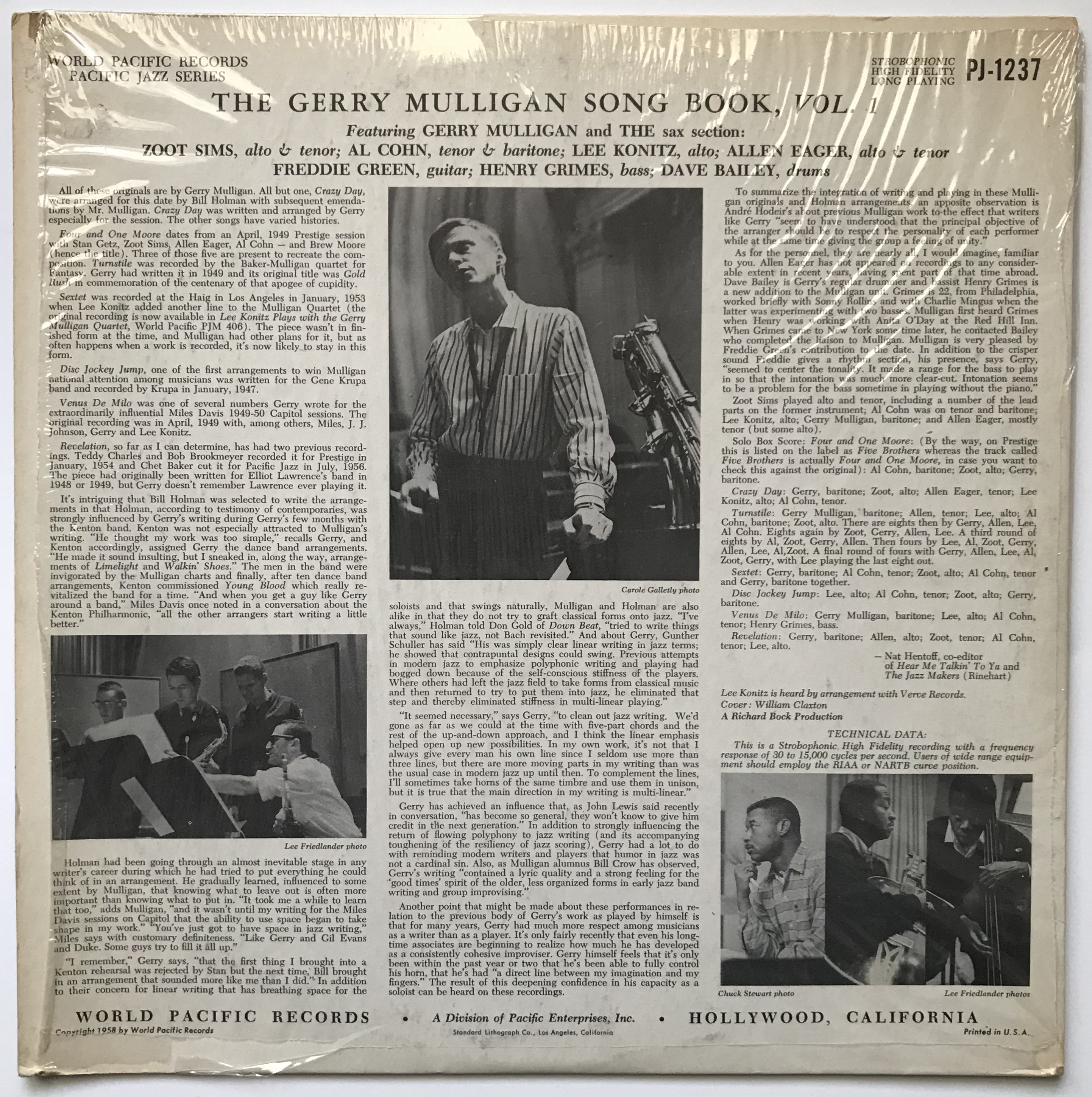 One thought on “The Gerry Mulligan Songbook Volume 1 // Gerry Mulligan Feat. Zoot Sims, Al Cohn, Lee Konitz, and Allen Eager (World Pacific Records PJ-1237)”