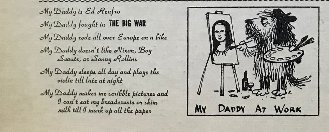 And then there’s the odd poem with the dog.  The only thing I could think of was that it was an involved pun on the RCA dog label.  RCA’s label has the famous dog listening to an old gramophone, with the caption “His Master’s Voice”.  This dog is at work says “My Daddy At Work”.  The first line says that the dad’s name is Ed Renfro.  I googled that name, and I groaned.  Who was Ed Renfro.  An artist from California who, among other things, did artwork for Fantasy Records.  Including this album’s artwork.  This poem is about him.  Fantasy.  Strikes.  Again.
