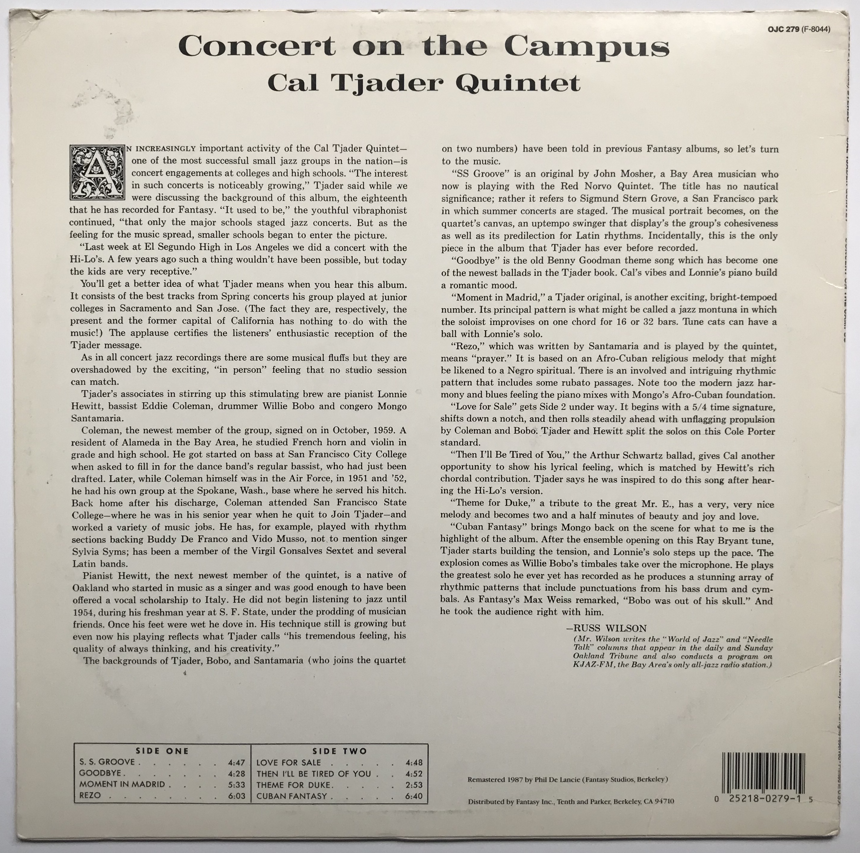 Taking a (momentary) break from Dave Brubeck and Paul Desmond, here’s another college concert album, this time recorded on the Best Coast in California. Following the example of his one-time leader Dave Brubeck (told you it was momentary), Cal Tjader took his good vibes directly to the students via college appearances. Luckily, Fantasy had a microphone connected to a tape recorder.