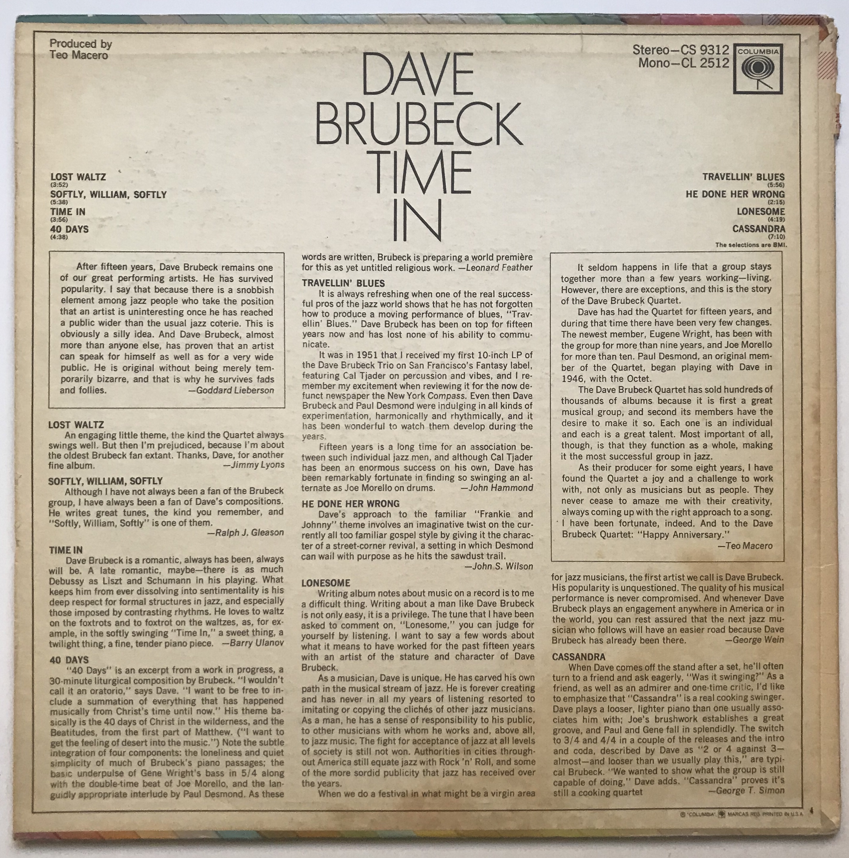 img_4892This album was released as a sort of 15th anniversary tribute album by Columbia, celebrating the Dave Brubeck Quartet’s 1951-1966 run.  In celebration of the event, Columbia tried to get different jazz critics/writers/luminaries to say something about each tune on the album.  Emphasis on “tried”.  Most did.  Some didn’t even bother.  For instance, George Wein, of Newport Jazz Festival fame, stated outright that “[t]he tune I have been asked to comment on, “Lonesome”, you can judge for yourself by listening.”  Other people tapped to contribute to the liner notes include Jimmy Lyons (“about the oldest Brubeck fan extant”), Ralph Gleason (with the slightly back-handed compliment), Leonard Feather (who wrote the absolutely scathing review of ‘Time Out’ in ‘Down Beat’) and Goddard Lieberson (president of Columbia Records and person responsible for putting ‘Time Out’ out despite resistance from within his own ranks).  I’m sure all the lovely things people said had Brubeck and his group blushing.