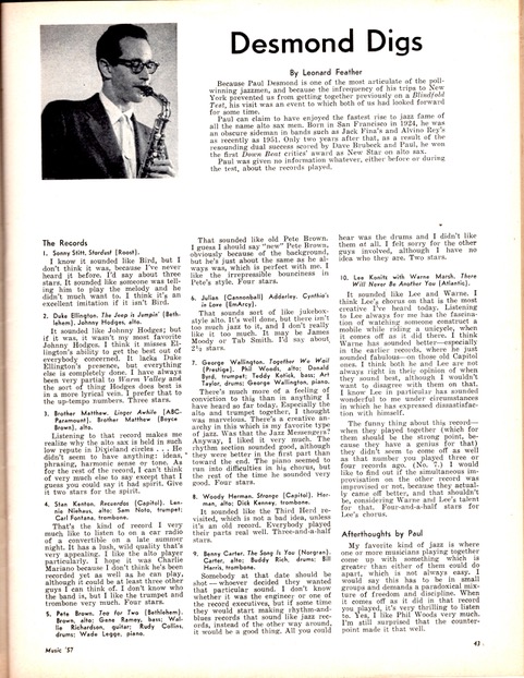 “Because Paul Desmond is one of the most articulate of the poll-winning jazzmen, and because the infrequency of his trips to New York prevented us from getting together previously on a Blindfold Test, his visit was an event to which both of us had looked forward for some time. Paul can claim to have enjoyed the fastest rise to jazz fame of all the name alto sax men. Born in San Francisco in 1924, he was an obscure sideman in bands such as Jack Fina’s and Alvino Rey’s as recently as 1951. Only two years after that, as a result of the resounding dual success scored by Dave Brubeck and Paul, he won the first Down Beat critics’ award as New Star on alto sax. Paul was given no information whatever, wither before or during the test, about the records played.”