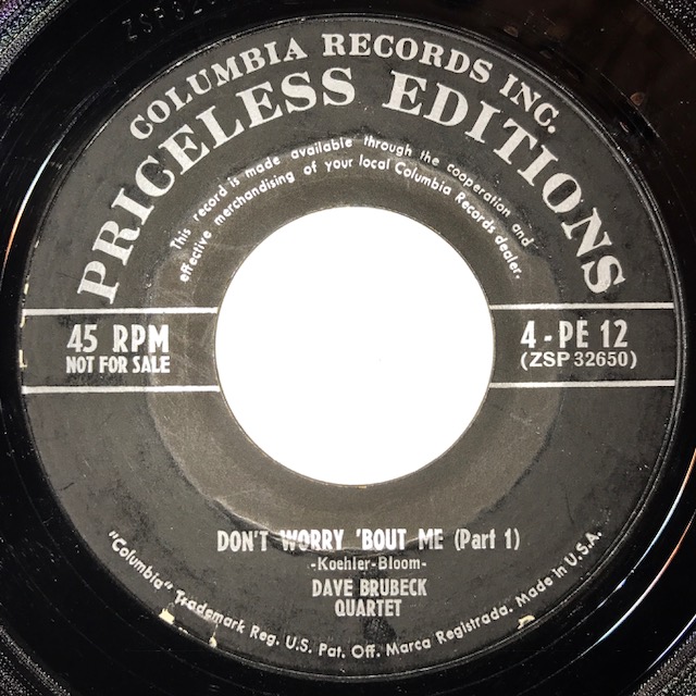 This extremely rare recording was released by Columbia during the summer of 1954 as part of a promotion. It was not for sale, but rather offered for a limited time for free by local record stores. In the liner notes to Brubeck’s Columbia album Dave Brubeck At Storyville: 1954, George Avakian wrote that the recording used for this Priceless Editions promotion was from Brubeck’s March 1954 concert at the University of Cincinnati, Ohio. However… SPECIAL NOTE: Upon listening to the track, it’s evident that this is not a college concert recording at all, but a night club. Further study reveals that this track comes from the same radio broadcast that made up part of the Storyville album on Columbia. Somehow somebody got things mixed up. This track is only available on this hard-to-find promotional 7-inch 45rpm disc.