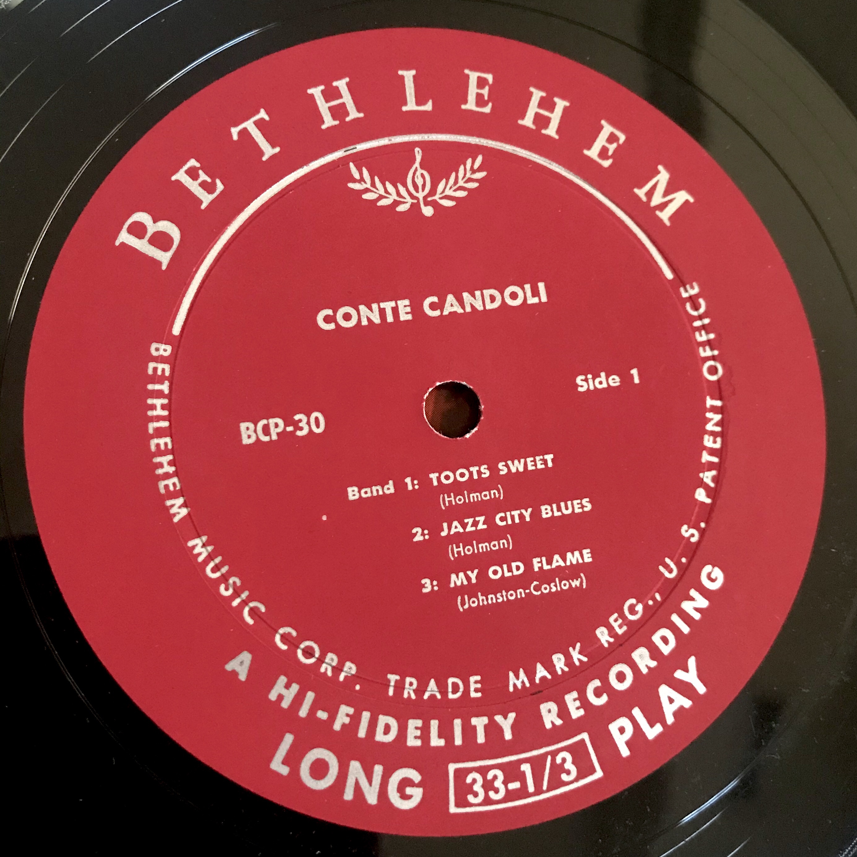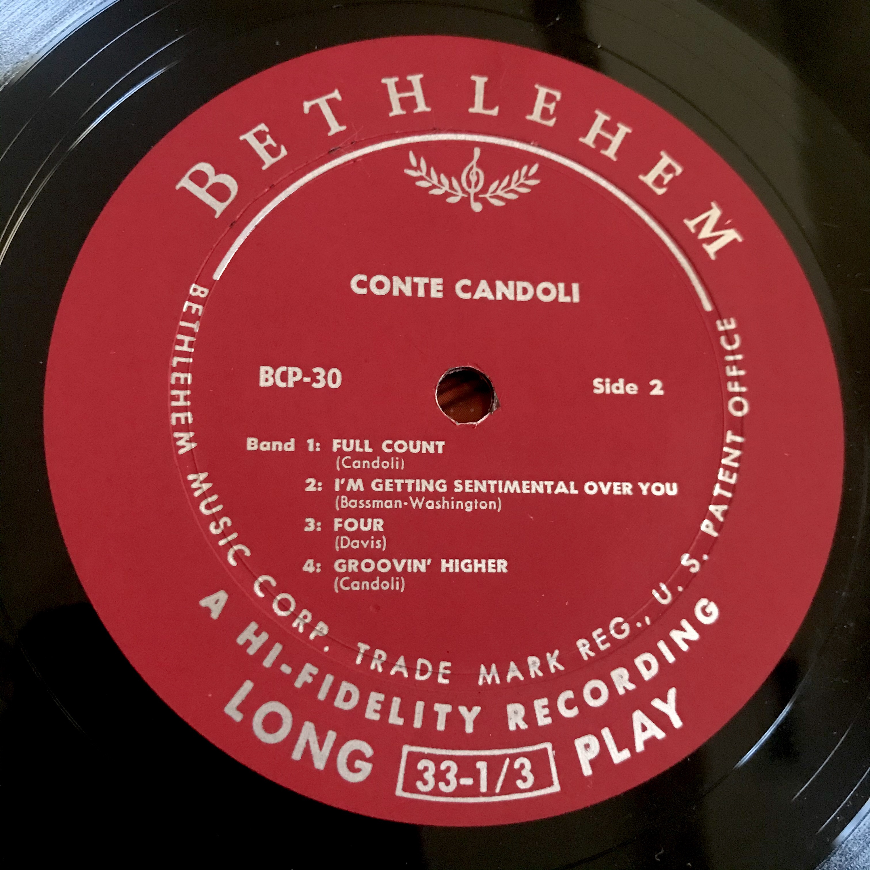 I love old 12-inch records. They’re heavy, thick, and have that delicious deep groove. This record could be used as a weapon it’s so heavy and thick. The labels are classic Bethlehem creations. As for the sound, it’s pretty crackly at the beginning but quiets down the further in the record you go. I personally don’t mind some crackle and surface noise. As long as it doesn’t overpower the music. The mix is kind of soft, but Candoli’s trumpet sparkles through. The main casualty is the bass, as was often the case in the pre-hifi hi-fi days. You know the bass is there, but it sounds rather muddy and plodding much of the time. I tend to ignore all the “Hi-Fi” claims plastered all over records from the early and mid-1950’s. Especially when it’s plastered on a Bethlehem record. While this is definitely the best-sounding original Bethlehem album I own (no doubt because it was recorded on the West Coast and not in New York like most of Bethlehem’s albums), hi-fi it is not. That is to say, it’s a typical-sounding jazz album from the mid-50’s, and that’s not a terrible thing at all. Val Valentin was the engineer, a guy who’s name would eventually grace record companies like Verve. By then, though, his engineering skills had greatly increased.