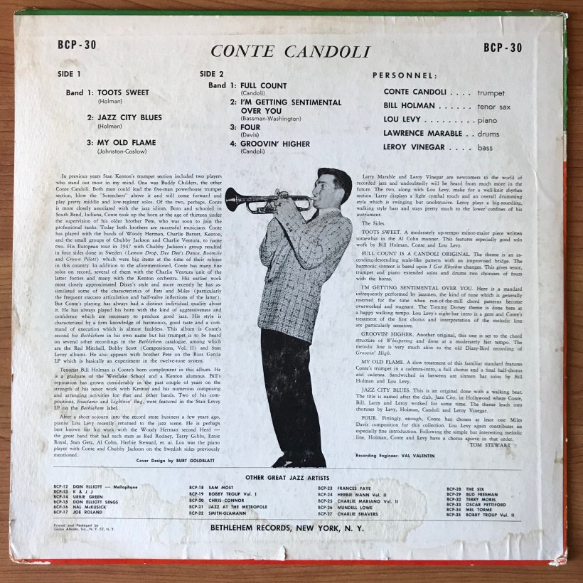 The liner notes are somewhat better than the cover art, but then again they misspelled Leroy Vinnegar’s name. Most of the notes are used to teach the reader who Conte and the rest of the guys are. Well, the three white guys, anyhow. Marable and Vinnegar, both black, get about one sentence each that’s specifically about them. Figure that one out. We do get a delightfully retro profile shot of Conte in action. The album jacket has definitely seen better days. Now that I think of it, I don’t think I have very many Bethlehem albums that don’t look like this…
