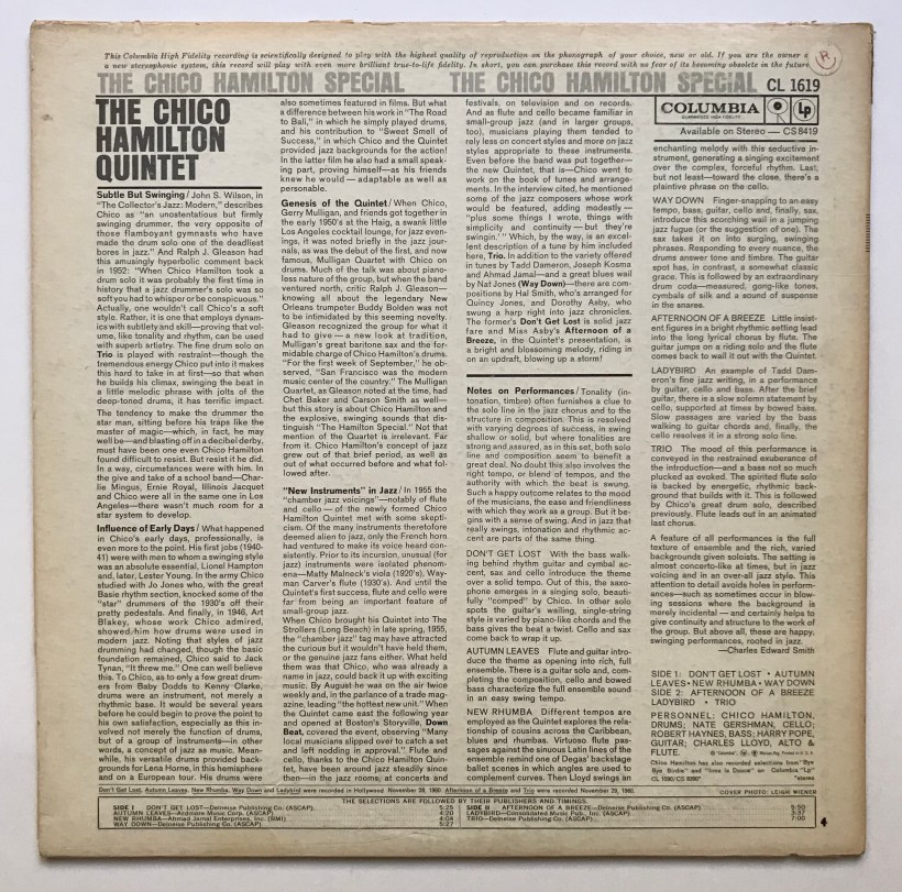When I came back home for the summer of 2015, I headed to the new record store in town, a place named, appropriately enough, Redlands Vinyl. Walking in that rainy day, I discovered this record in the jazz section. I was shocked because I didn’t know Chico Hamilton had recorded for Columbia. Seeing “Lady Bird” and “New Rhumba” on the cover (as well as the amount of liner notes), I grabbed it. The vinyl looked great, the price was great ($10), and since I was in Southern California, it just seemed right to buy a fellow Southern Californian’s record. I’m glad I did.