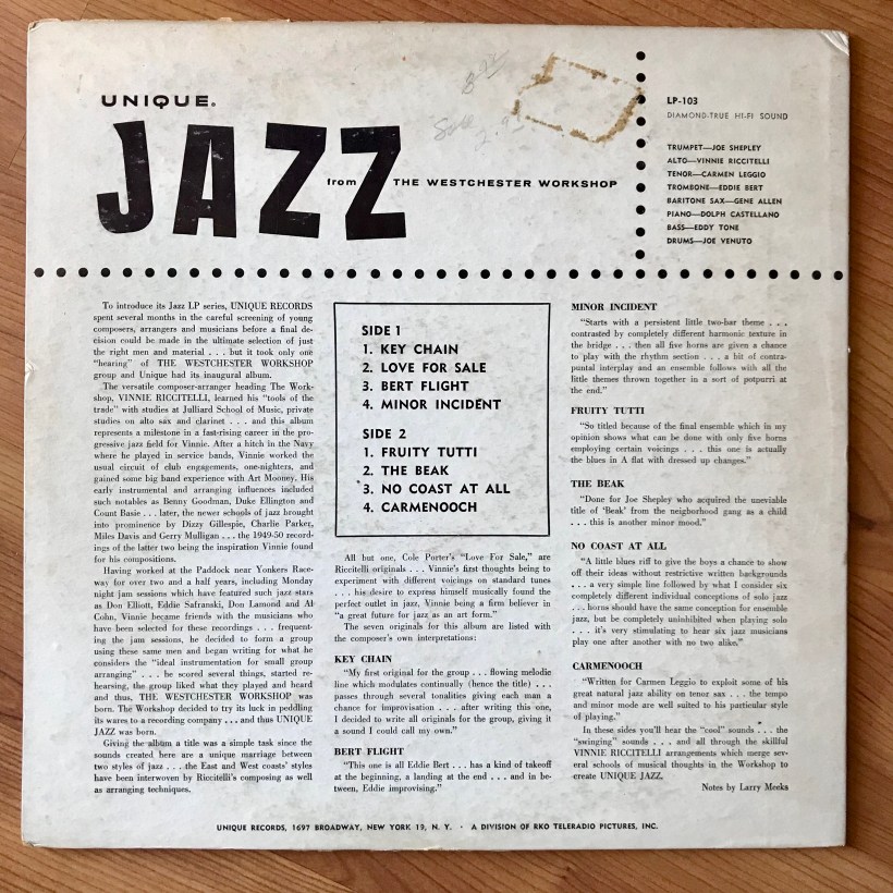 And who was Unique Records, anyhow? A Google search shows that they were a short-lived venture by RKO, the company most-known for radio and TV broadcasting. In 1955, they decided to try their hand at the record industry and bought a record label named Unique Records. While they released quite a few titles, including some rather interesting jazz titles, the label went under shortly after 1960 began.