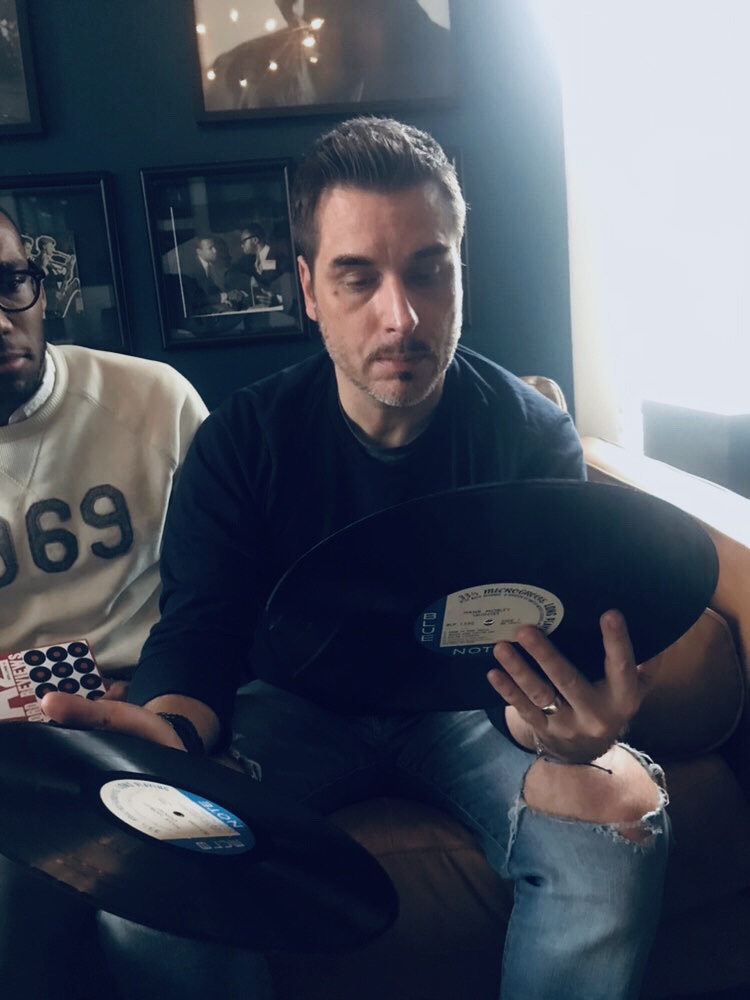 DJ Pari examining my two copies of Paul Desmond’s ‘Sketchin’ album on Blue Note while I look over his shoulder.