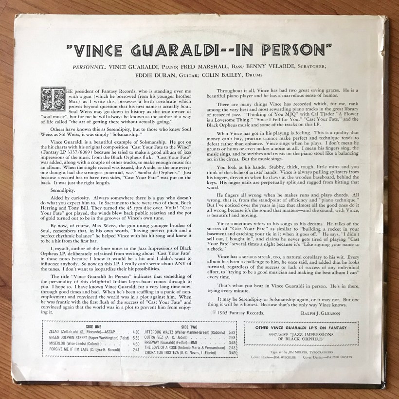 Ralph Gleason is again on hand for the liner notes, as was his custom for Fantasy Records, contributing some prose that mentions everything but the music within. Well, it sorta makes a glancing reference to the music. “So now on this LP, I really can’t write about ANY of the tunes. I don’t want to jeopardize their hit possibilities.” And he was serious. So all you have is a commercial for Vince Guaraldi.