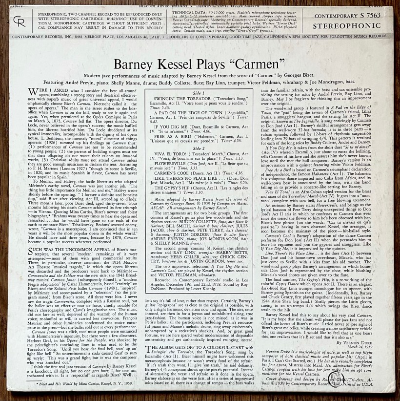 Down Beat Magazine, however, didn’t think so. Reviewing the album in 1959, John Tynan wrote that while Kessel’s handling of the material was “clever, the performances skillful” and that “the album is laced throughout with a rich sense of humor”, it was overall “unsuccessful in empirical practice.” In fact, despite again noting the fine musicianship involved, he writes that the “effort on the whole becomes boring”. He concludes his review by casting doubt if ‘Carmen’ is proper material for modern jazz. He gives the album three stars, “for the musicianship”. Ouch. What do you think? Do you agree?
